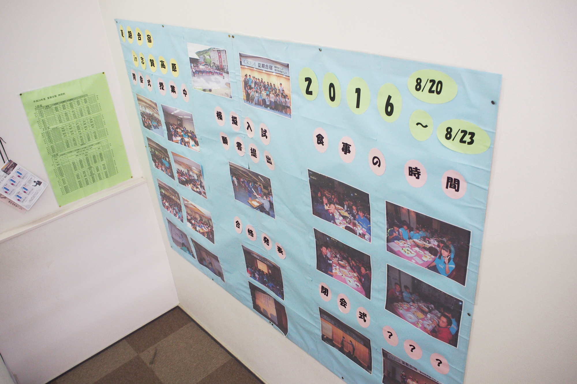 校舎内には様々な掲示物があります。勉強のやる気を高めるものや塾のイベントや授業の写真などを掲示しています。