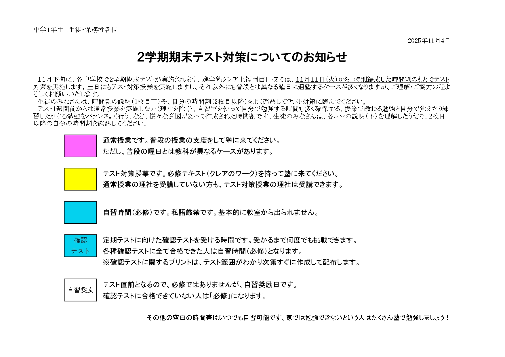 2025年12月25日(木)より冬期講習を開講します。入試や3学期・新年度を見据えて、力をつけていく期間です。クレアが初めての方の特典として、進学塾クレアでは中2生以下講習費無料、個別指導塾クレアでは非受験生講習費1科目無料となっています。