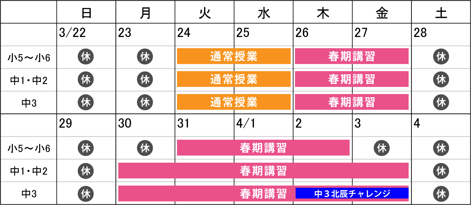中学3年生は、4月からほぼ毎月実施される北辰テストに備え、特別講座「北辰チャレンジ」を実施します。北辰テストは学校の定期テストとは異なり、長文読解・英作文・リスニング、数学の総合問題、国語の作文など、幅広い力が問われます。4月2日(木)に北辰模擬テスト → 4月3日(金)に解説授業という流れで実戦力を養います。