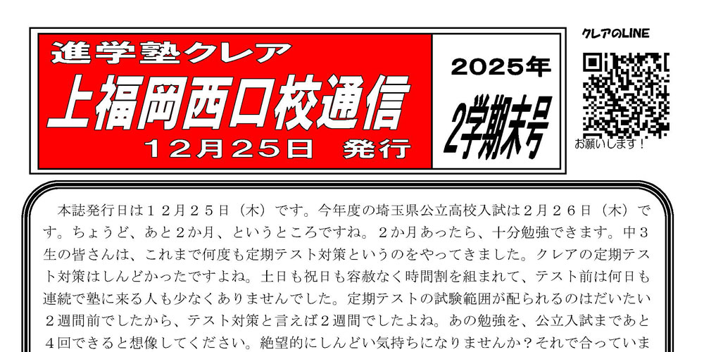 2025年12月25日(木)より冬期講習を開講します。入試や3学期・新年度を見据えて、力をつけていく期間です。クレアが初めての方の特典として、進学塾クレアでは中2生以下講習費無料、個別指導塾クレアでは非受験生講習費1科目無料となっています。